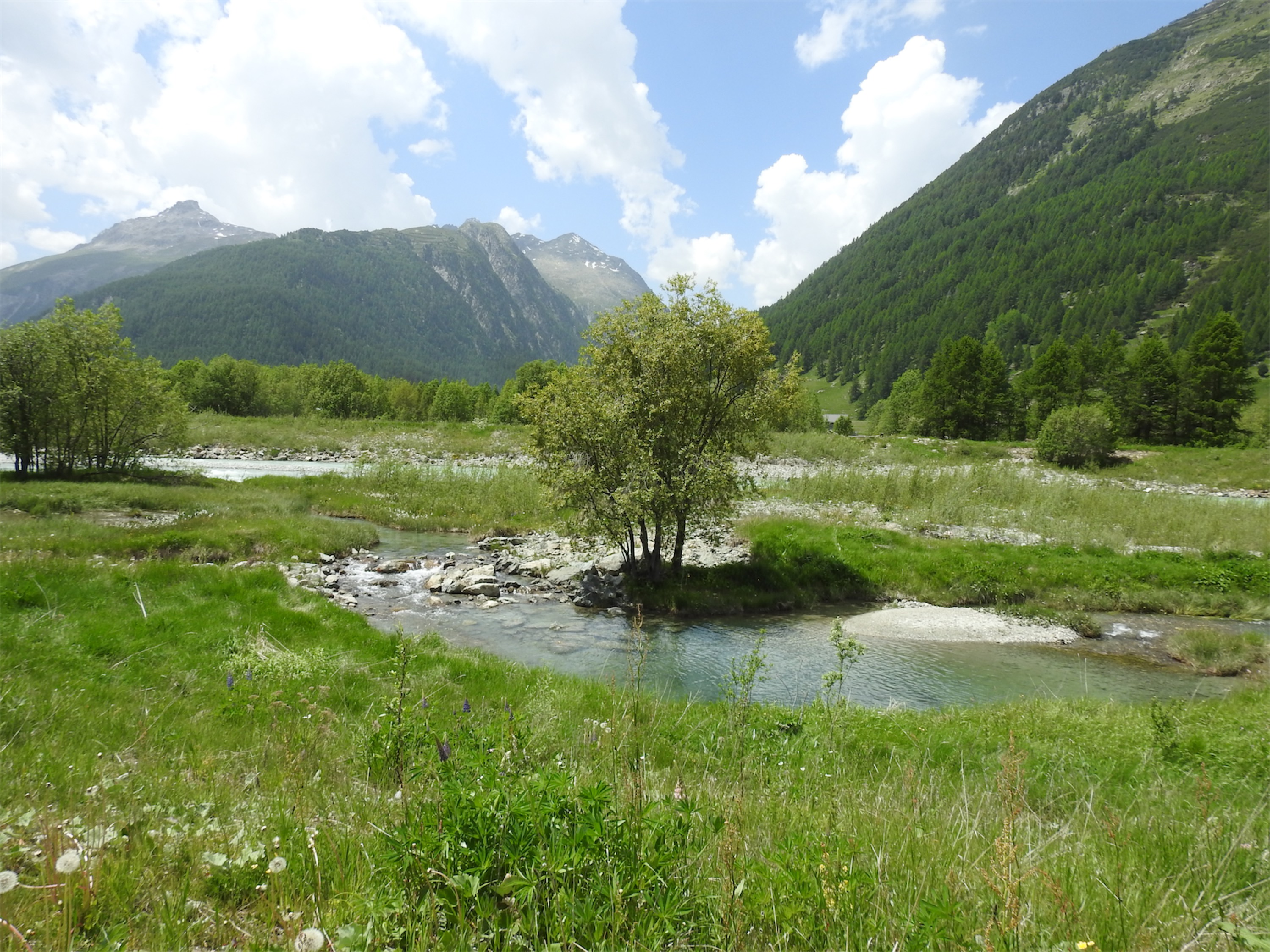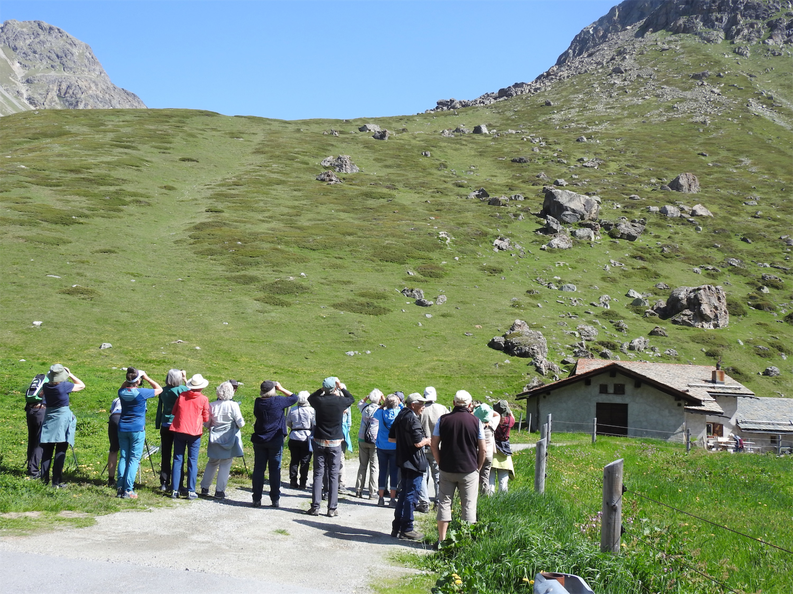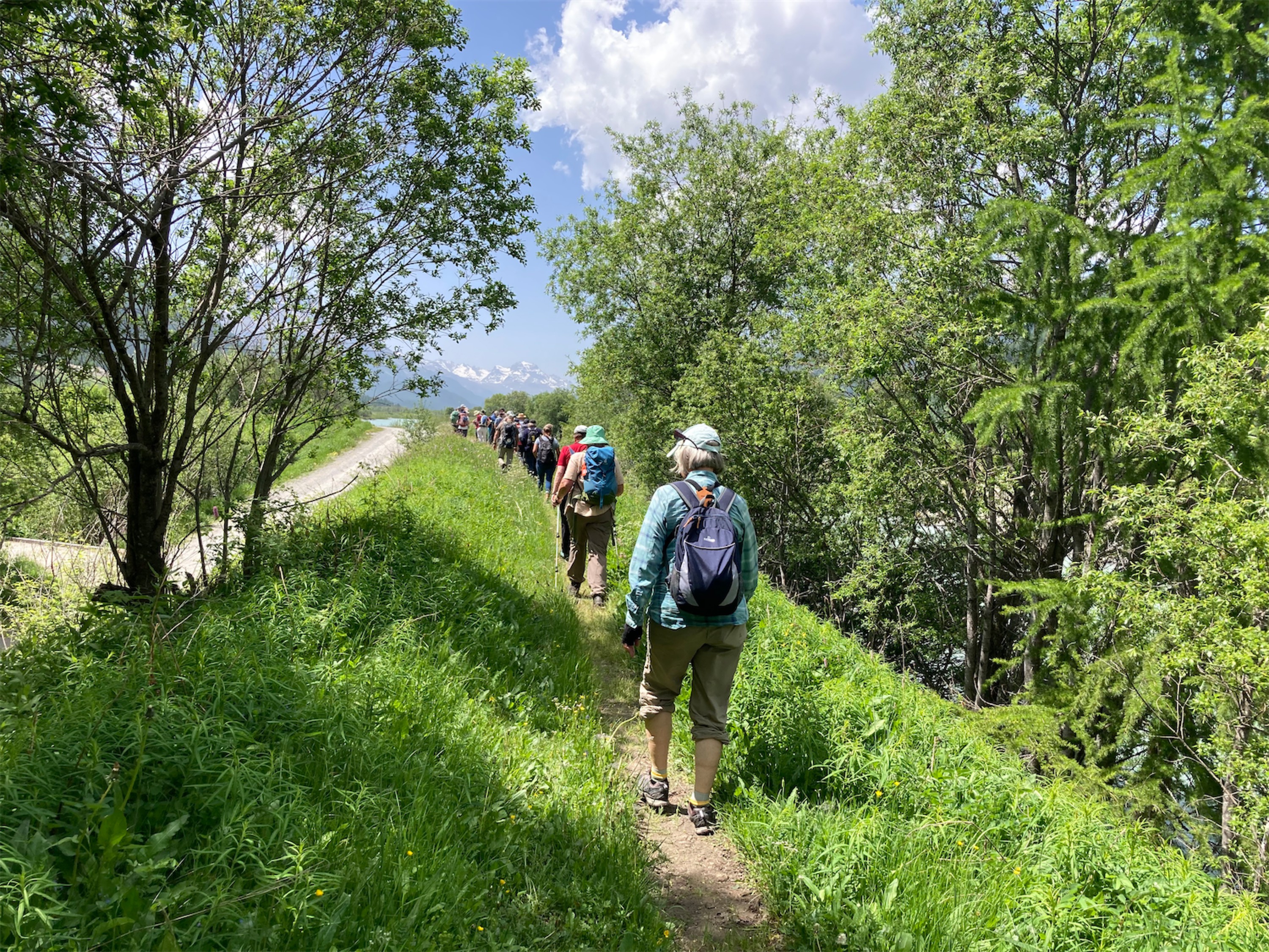 Nach einer kurzen Fahrt steigen wir bei La Punt aus und machen uns dem kanalisierten Inn entlang auf den Weg zu den revitalisierten Innauen. Wir erleben die Veränderung eindrücklich. Sergio, unser Präsident, erzählt uns Fakten und Geschichten, wie aus dem Inn, der in früheren Zeiten Überschwemmungen und Unsicherheit brachte, dann durch Dämme gezähmt wurde, wie aus diesem Gewässer eine naturnahe, diverse Landschaft entstand, für Tiere, Pflanzen und Menschen wertvoll. Während wir zuhören, wagt sich ein Braunkehlchen auf dem Zaun, der den Besucherstrom leitet, zu unserer Freude immer näher. Vielleicht will es wissen, ob es auch erwähnt wird. Es wird nicht.